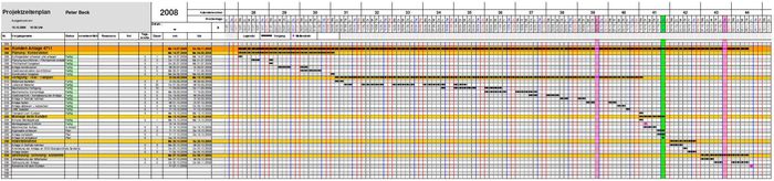 Erfolgsfaktor Zeit Speziell den Faktor Zeit kann man mittels den Planungsmethoden Netzplantechnik und Meilensteinpläne oder mit Hilfe eines Gantt-Diagrammes sehr schön visualisieren und so den kritischen Pfad oder kritische Terminsituationen rechtzeitig erkennen und gegensteuern. Es gibt viele kostenlose und natürlich auch sehr teure Softwaretools die das Projektmanagement unterstützen. Dabei wird für manche Tools sehr viel Geld ausgegeben um nur Terminpläne bzw. Projektzeitenpläne zu zeichnen. Das Kosten- und Ressourcenmanagement dieser Tools werden dabei schlicht nicht angewant. Genau diesen Sachverhalt habe ich mir zum Thema gemacht. Um Projektzeiten übersichtlich darstellen zukönnen, ohne ein teures Softwaretool zu kaufen, habe ich in MS Excel ein kleines Tool entwickelt, welches als einfaches Gantt-Diagramm den Projektablauf und die Projektzeiten visualisiert. Dabei sind einige Automatismen implementiert. Selbst einfache Vorgangsverknüpfungen sind möglich. Projektzeitenplan mit Excel